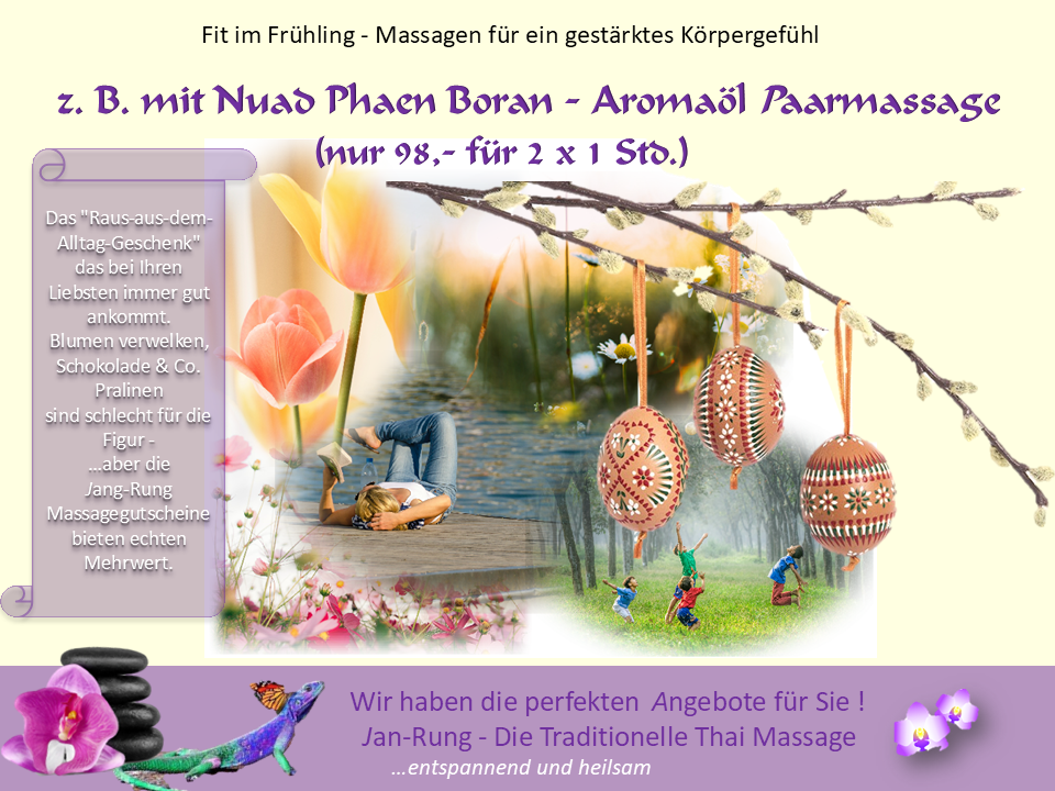 Bei Jan-Rung – Thai Spa Wellness & Massagen Oberhausen – finden Sie ein breites Angebot rund um Ihre ganz persönliche Wellness. Ein gesunder und entspannter Körper ist die Basis für einen gesunden und entspannten Geist. Daher sollte man beiden häufiger etwas ganz Besonderes gönnen.